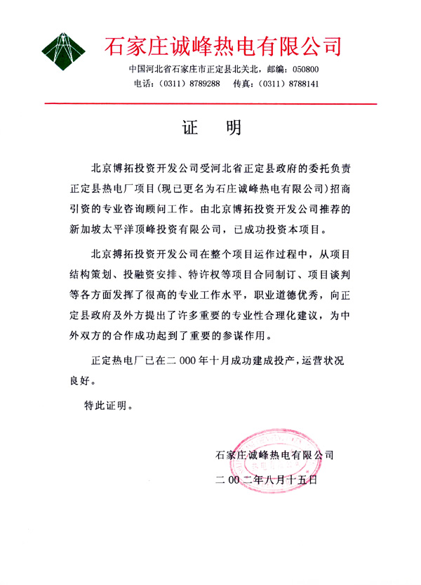 北京博拓投资开发公司受河北省正定县的委托负责正定县热电厂项目(现已更名为石家庄诚峰热电有限公司)招商引资的专业咨询工作。由北京博拓投资开发公司推荐的新加坡太平洋顶峰投资有限公司,已成功投资本项目。