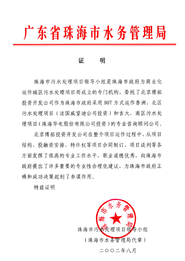 广东省珠海市水务管理局 证明 珠海市污水处理项目领导小组是珠海市政府为商业化运作城区污水处理项目而成立的专门机构,委托了北京博拓投资开发公司作为珠海市政府采用BOT方式运作香洲、北区污水处理项目(法国威望迪公司投资)和吉大、南区污水处理项目(珠海华电股份有限公司投资)的专业咨询顾问公司。 北京博拓投资开发公司在整个项目运作过程中,从项目结构、投融资安排、特许权等项目合同制定、项目谈判等各方面发挥了很高的专业工作水平,职业道德优秀,向珠海市政府提出了很多重要的专业性合理化建议,为珠海市政府正确和成功决策起到了参谋作用。 特兹证明 珠海市污水处理项目领导小组 二00二年八月 |